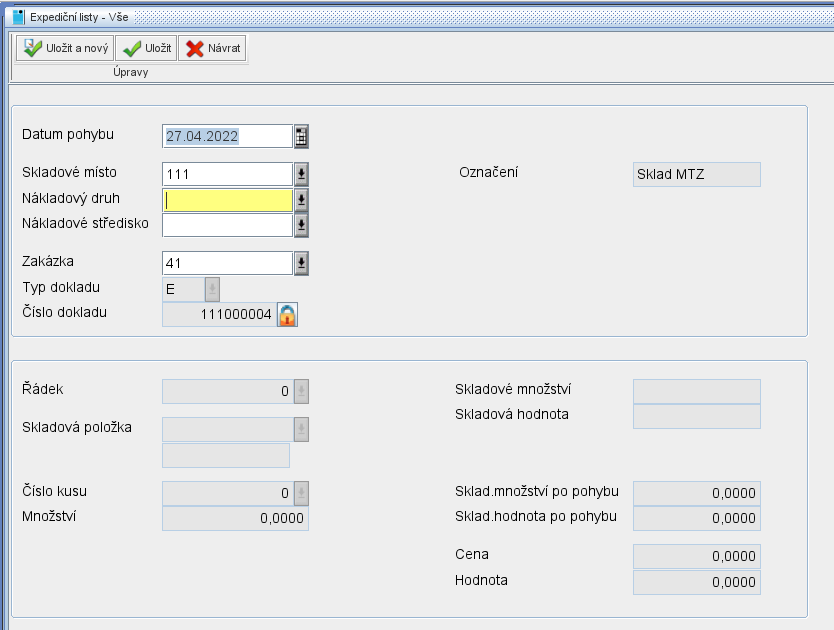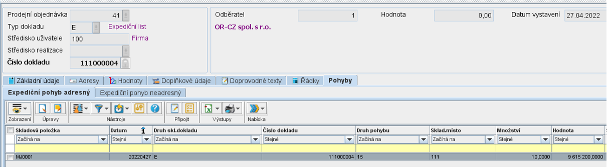 Po zápisu pohybu se automaticky propíší řádky expedičního listu.