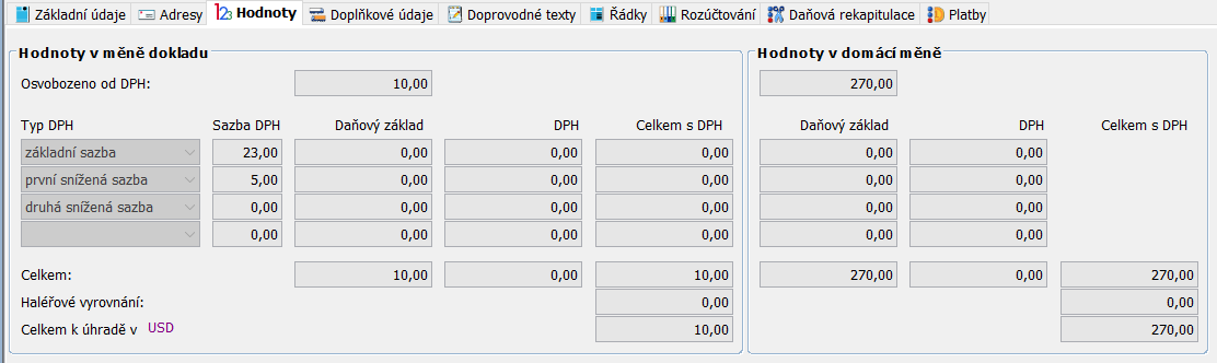 Hodnoty v měně dokladu a v domácí měně udávají jednotlivé hodnoty včetně automatického přepočtu dle platných sazeb DPH.