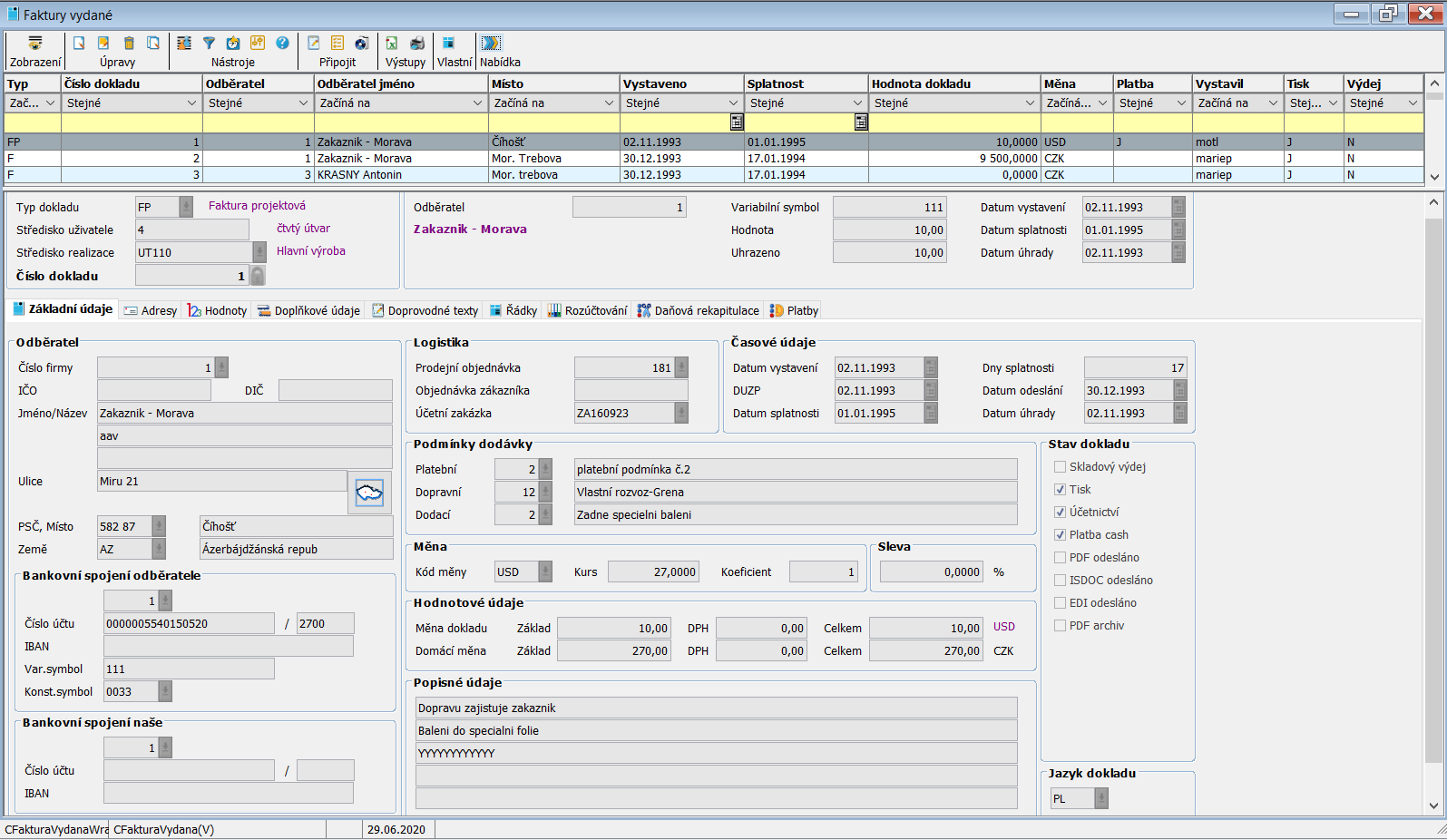 Základní údaje obsahují informace o odběrateli, bankovním spojení, logistice, dále obsahují časové údaje dodávky, podmínky dodávky, měna , popis a stav dokladu. Dále je možné zvolit jazyk dokladu.