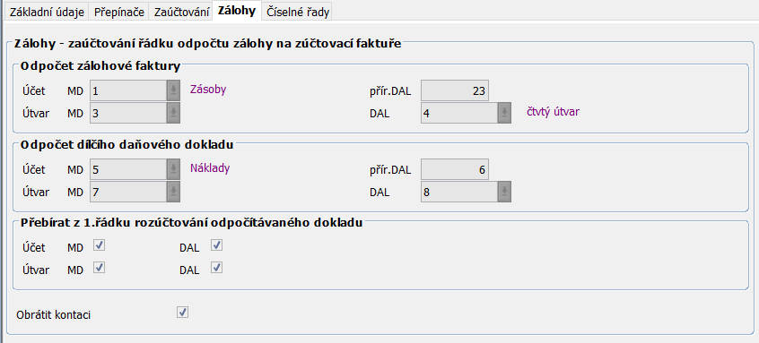 Obsahuje potřebné parametry pro správnou funkci zaúčtování včetně účtování dle platných sazeb DPH.