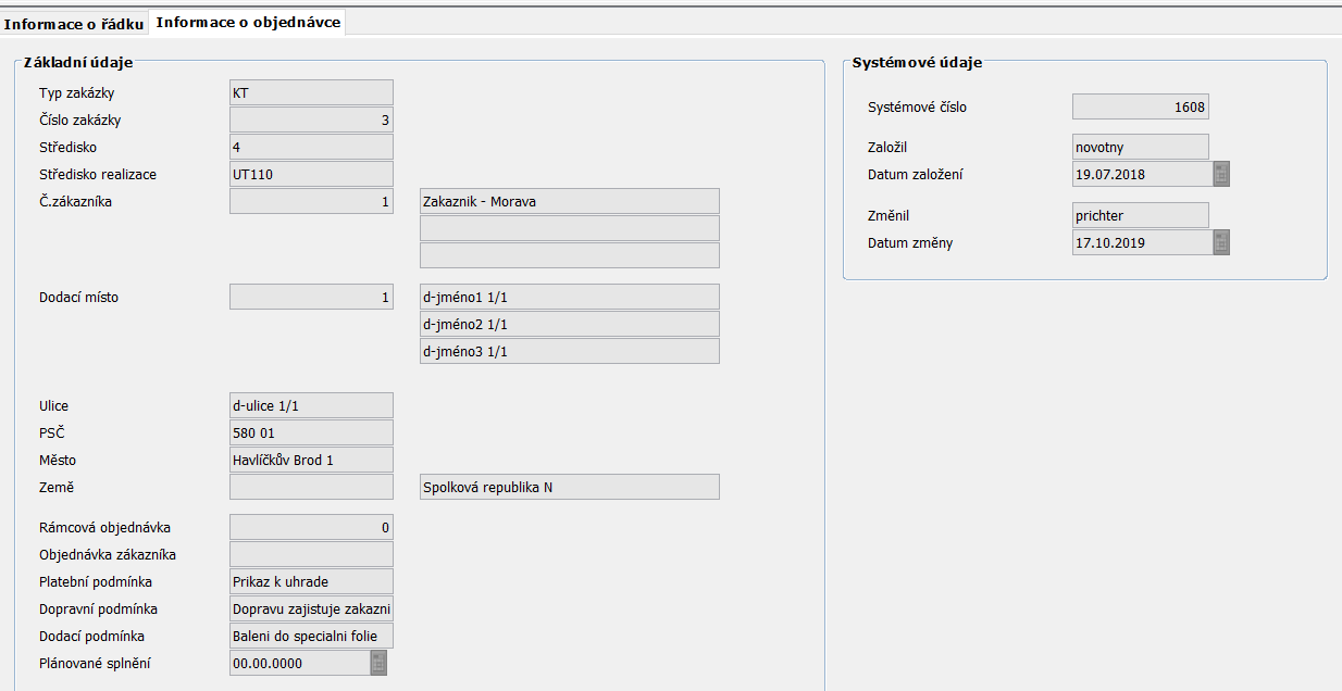 Informace o objednávce obsahují Základní údaje (identifikace zakázky, informace o zákazníkovi, adresa dodání, podmínky platby, dopravy a dodávky, …) a Systémové údaje (informace o autorovi a poslední provedené změně).
