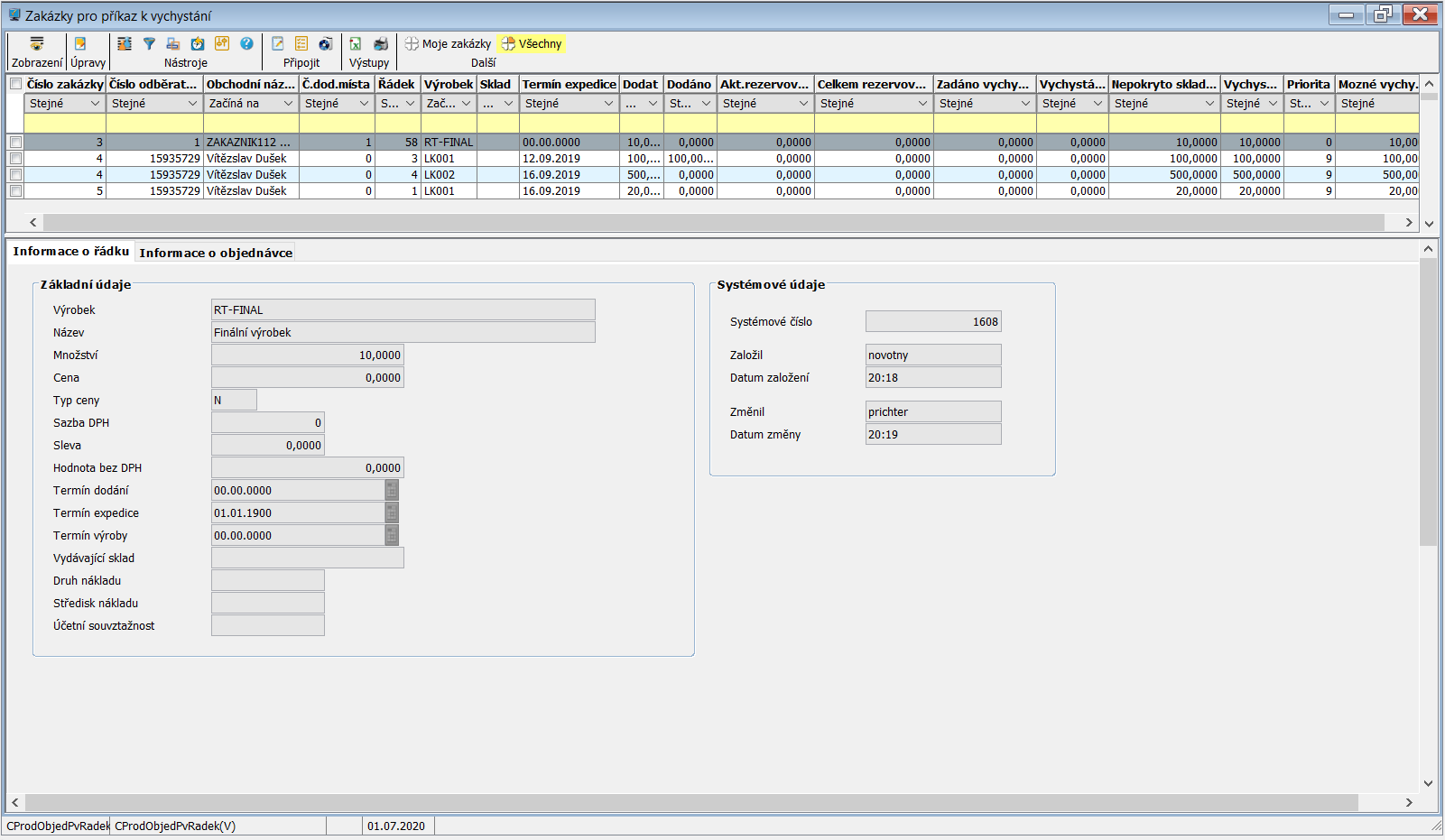Informace o řádku obsahují Základní údaje (identifikace a název výrobku, množství, cena a její parametry, termíny dodání, expedice a výroby, …) a Systémové údaje (informace o autorovi a poslední provedené změně).