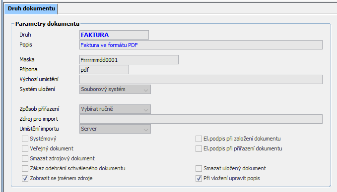 Popis - popis, který se bude zobrazovat při práci s daným druhem el. dokumentu. Slouží pro zpřehlednění a snadnější orientaci. Doporučuje se volit krátké a výstižné popisy jako Faktura, Přijatá faktura, Objednávka apod.