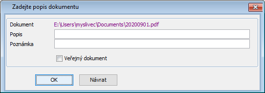 Při vložení upravit popis - při vkládání dokumentu k dokladu je po výběru zdroje možno upřesnit Popis, Poznámku a příznak Veřejného dokumentu