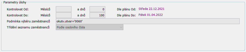 Kontrolovat Od: Měsíců a dnů - počet měsíců a/nebo dnů „od“ vzhledem k datu spuštění (pro kontrolu datumu v záznamu), tj. doba kontroly zpět. Je-li 0 (nula), kontroluje se od data spuštění. Je-li nevyplněno, kontroluje se vše minulé.