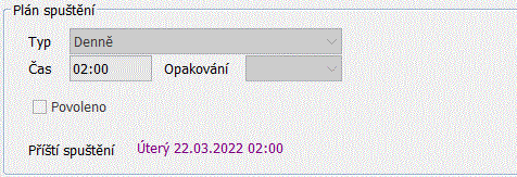 Spustit úlohu - okamžité ruční spuštění úlohy, bez ohledu na plán. Pokud se po spuštění objeví hláška „… Plánovač úloh není aktivní, zkontrolujte konfiguraci plánovače“, je potřeba ve volbě Nabídka/Nastavení vyplnit login, pod kterým se budou úlohy spouštět.