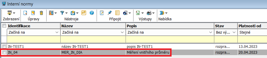 V případě, že chceme normu editovat, či smazat, musí být ve stavu „Rozpracovaný“. Pomocí zaškrtnutého pole checkboxu (vlevo) vybereme jeden, nebo více záznamů. Nastavení stavu provádíme pomocí tlačítka Nabídka