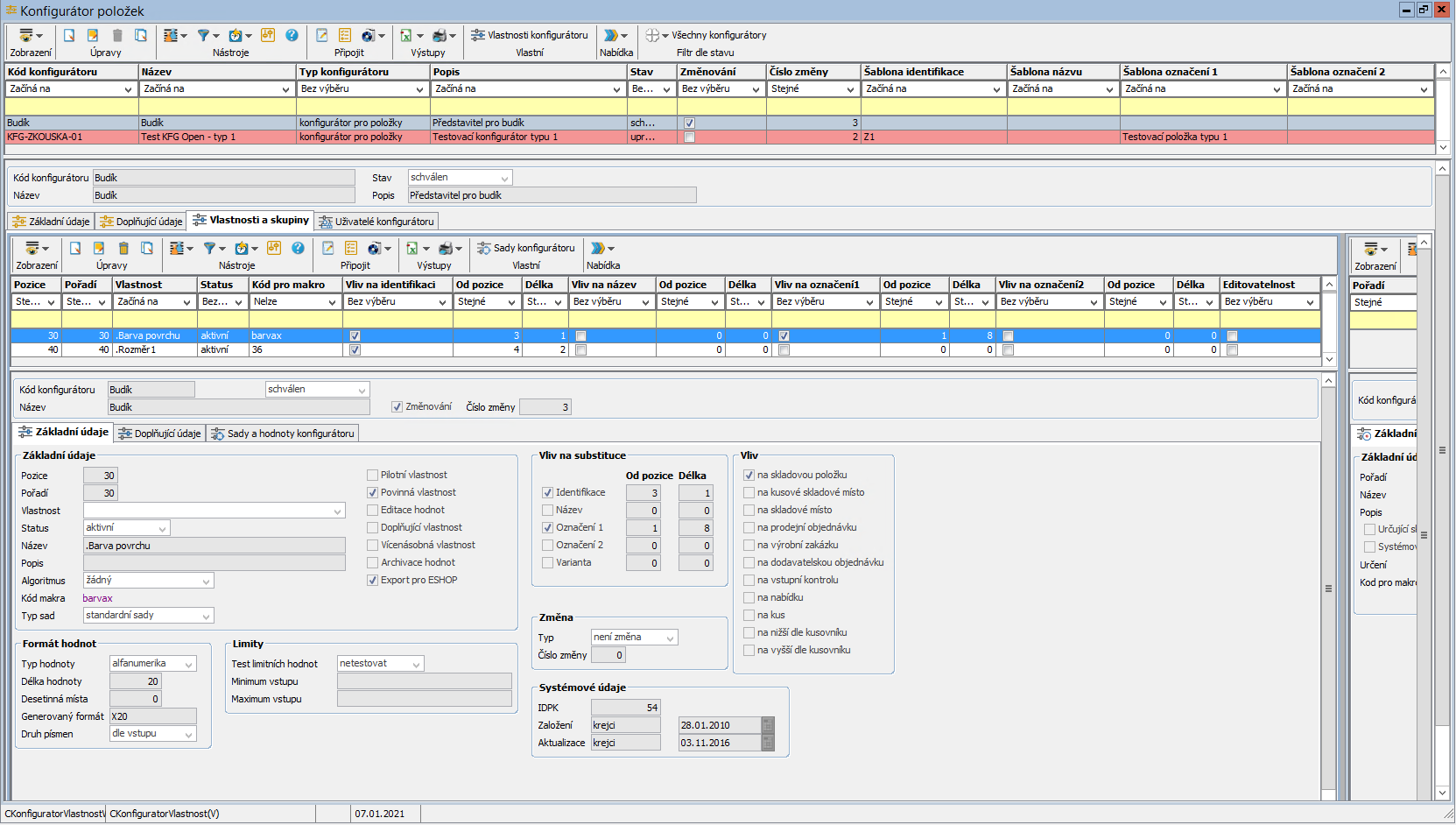 - Povinná vlastnost – má význam hlavně u vlastností, které nemají vliv na identifikační číslo, ale jsou důležité pro identifikaci položky – vliv na pořadí, zamezuje duplicitě. Při založení nové položky program kontroluje, jestli kombinace povinných vlastností již existuje a pokud ne, tak přiřadí číslo o jedno vyšší podle pořadí v konfigurátoru.