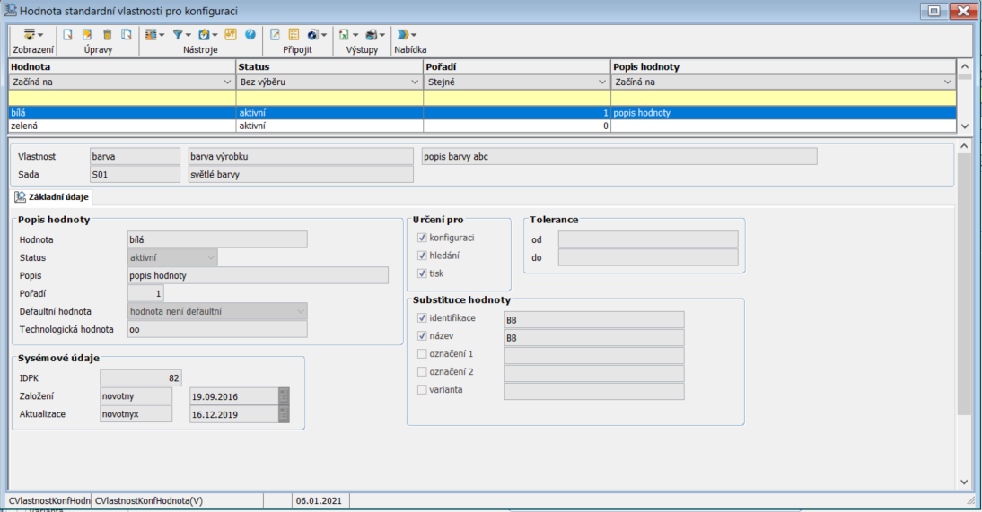 Tato úloha slouží k evidenci jednotlivých hodnot standartní vlastnosti, které jsou dále seskupovány do jednotlivých sad vlastností pomocí vazebních atributů. Jedná se o evidenci všech hodnot ze všech sad vlastností, které mají vazbu na vybranou standartní vlastnost.