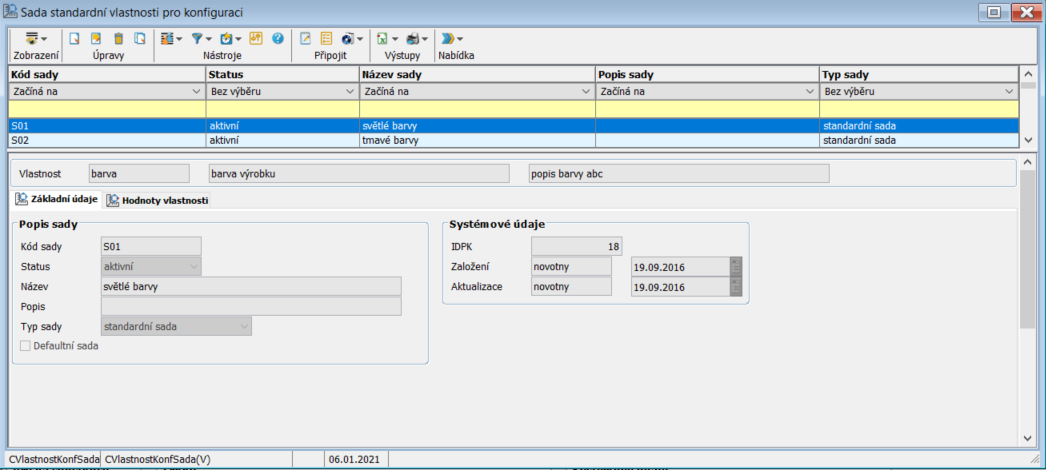 Tato úloha slouží k seskupení jednotlivých hodnot standardní vlastností do vybraných skupin (sady vlastnosti) za účelem přehlednějšího třídění a výběru jednotlivých vlastností. Každá hodnota je vázána přímou vazbou na standardní vlastnost, avšak díky vazbě na sadu standartní vlastnosti můžeme tyto hodnoty lépe kategorizovat a blíže specifikovat.