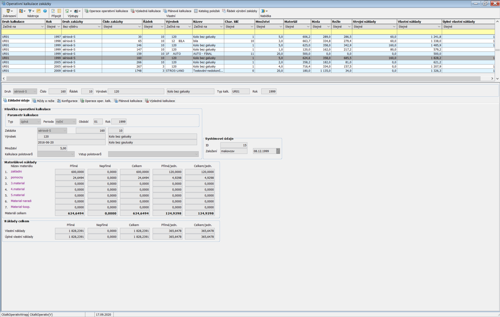Uložené hodnoty jednotlivých operativních kalkulací jsou počítány na dané množství výrobní zakázky a jsou rozčleněny do definovaných položek kalkulačního vzorce (viz. parametry kalkulace).