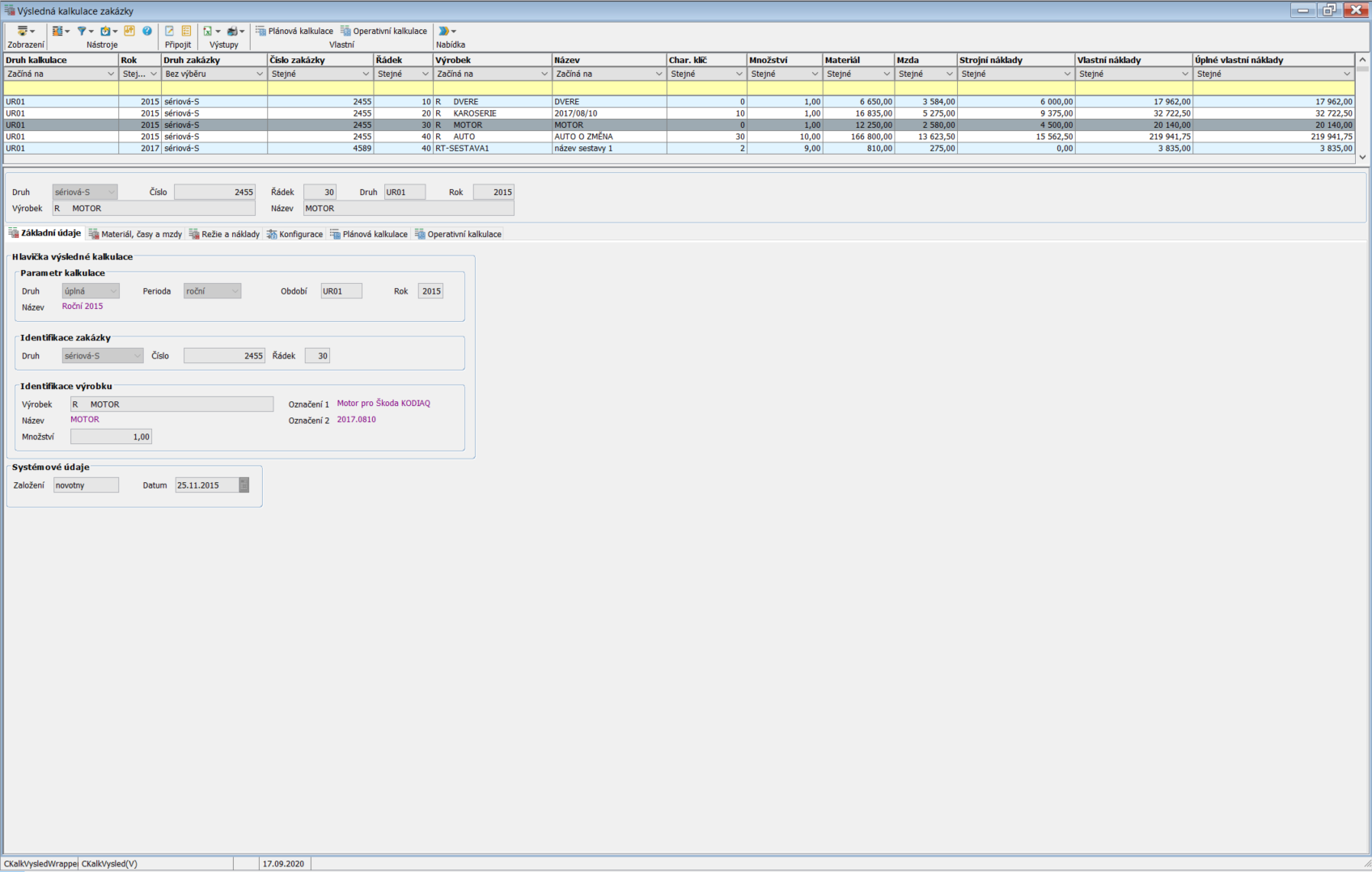 Výsledná kalkulace je vztažena vždy důsledně k danému řádku výrobní zakázky. Pro každý řádek výrobní zakázky je vytvořena jedna kalkulace zakázky s nastaveným parametrem kalkulace.