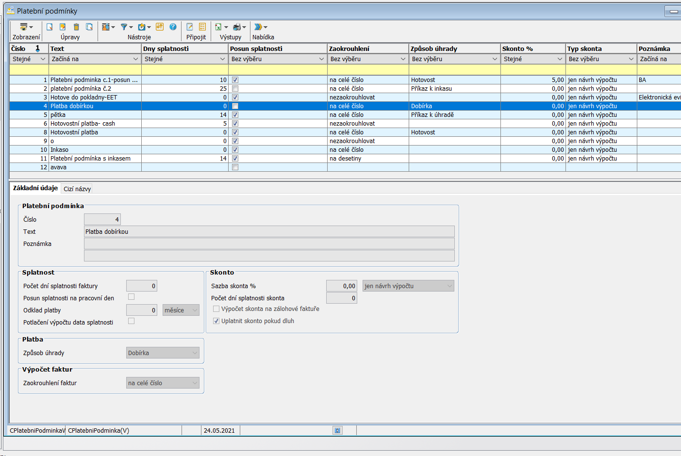Číselník platebních podmínek - tyto hodnoty je možné přiřadit implicitně k Dodavatelům/Odběratelům. Hodnoty se do Nákupní/Prodejní objednávky přebírají z Adresáře firem, ale je možné je v konkrétním dokladu změnit.