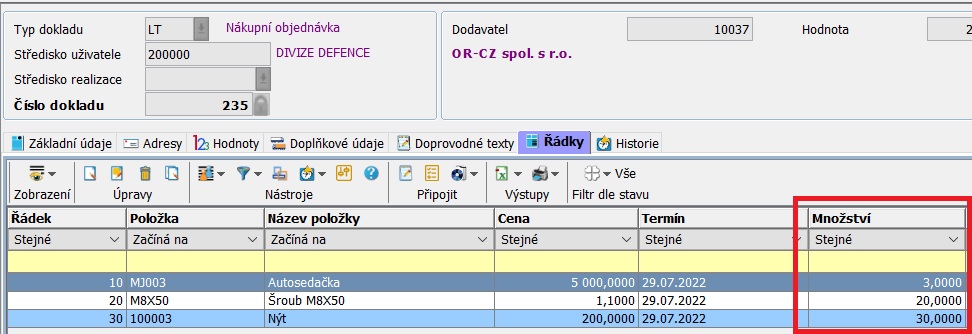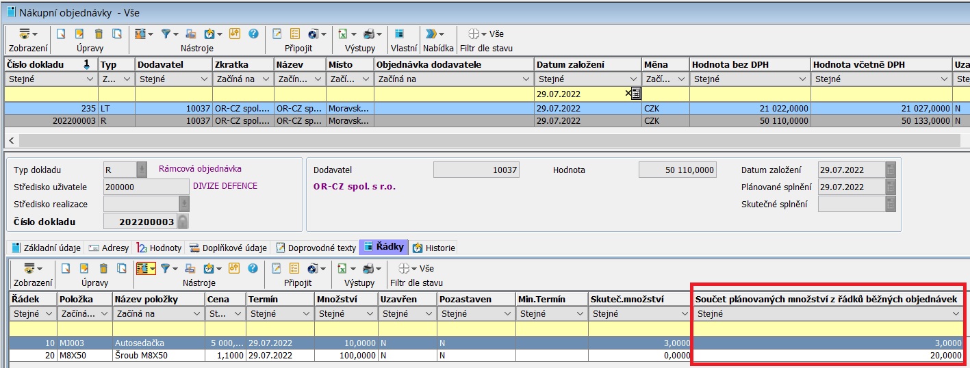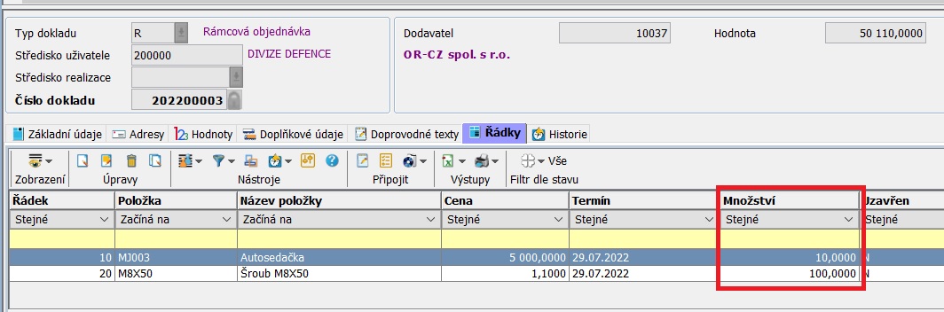 Řádky nákupní objednávky, která je spojená s rámcovou nákupní objednávkou. Důležité je zapsané množství u konkrétních položek.
