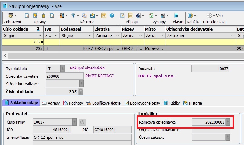 Vazba nákupní objednávky na rámcovou nákupní objednávku