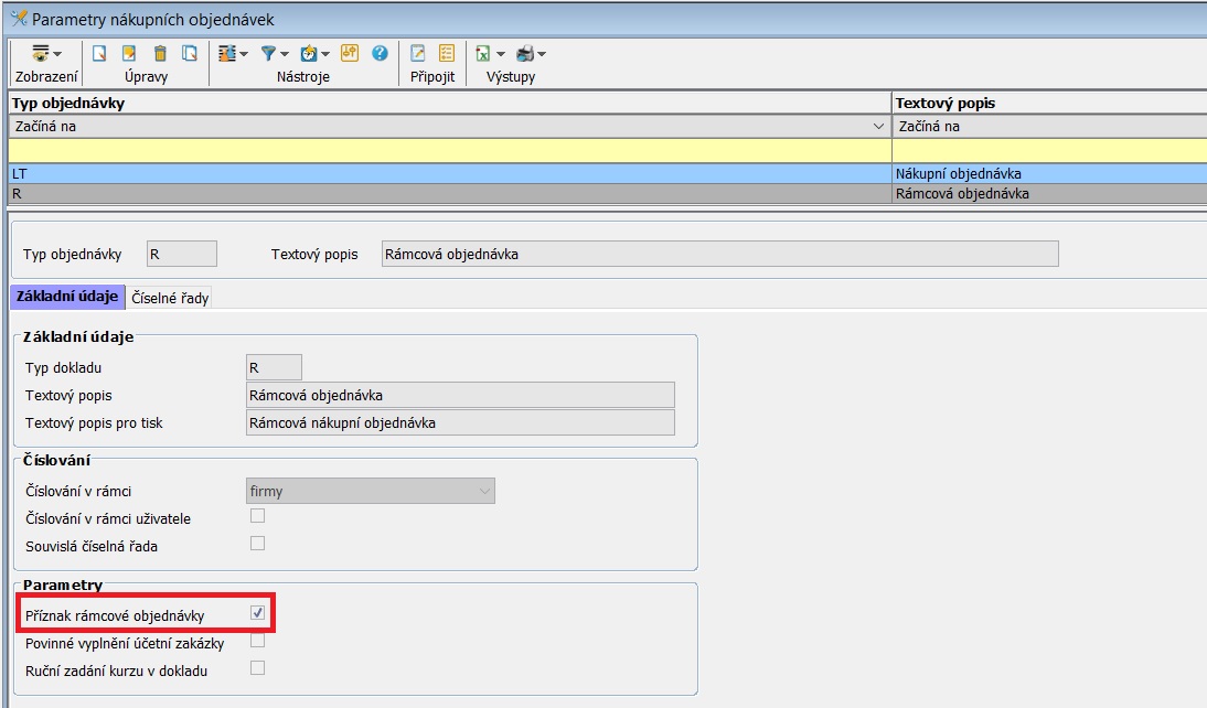 Definování rámcové objednávky se provádí v parametrech nákupních objednávek. Zde je důležité vyplnit checkbox „Příznak rámcové nákupní objednávky“ (pz_r_ak).