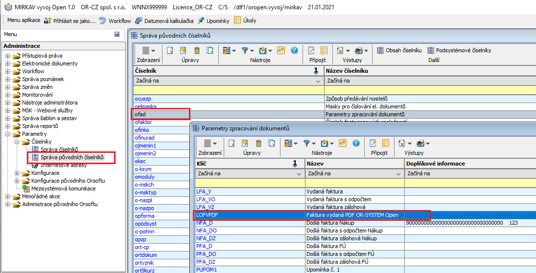 - Neexistuje-li v číselníku „ofad“ hodnota „LOFVARC“ je potřeba ji doplnit Administrace → Parametry → Číselníky → Správa původních číselníků → číselník „ofad“