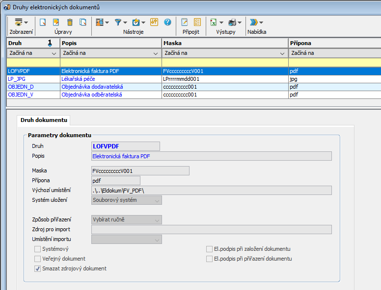 Administrace → Elektronické dokumenty → Druhy elektronických dokumentů