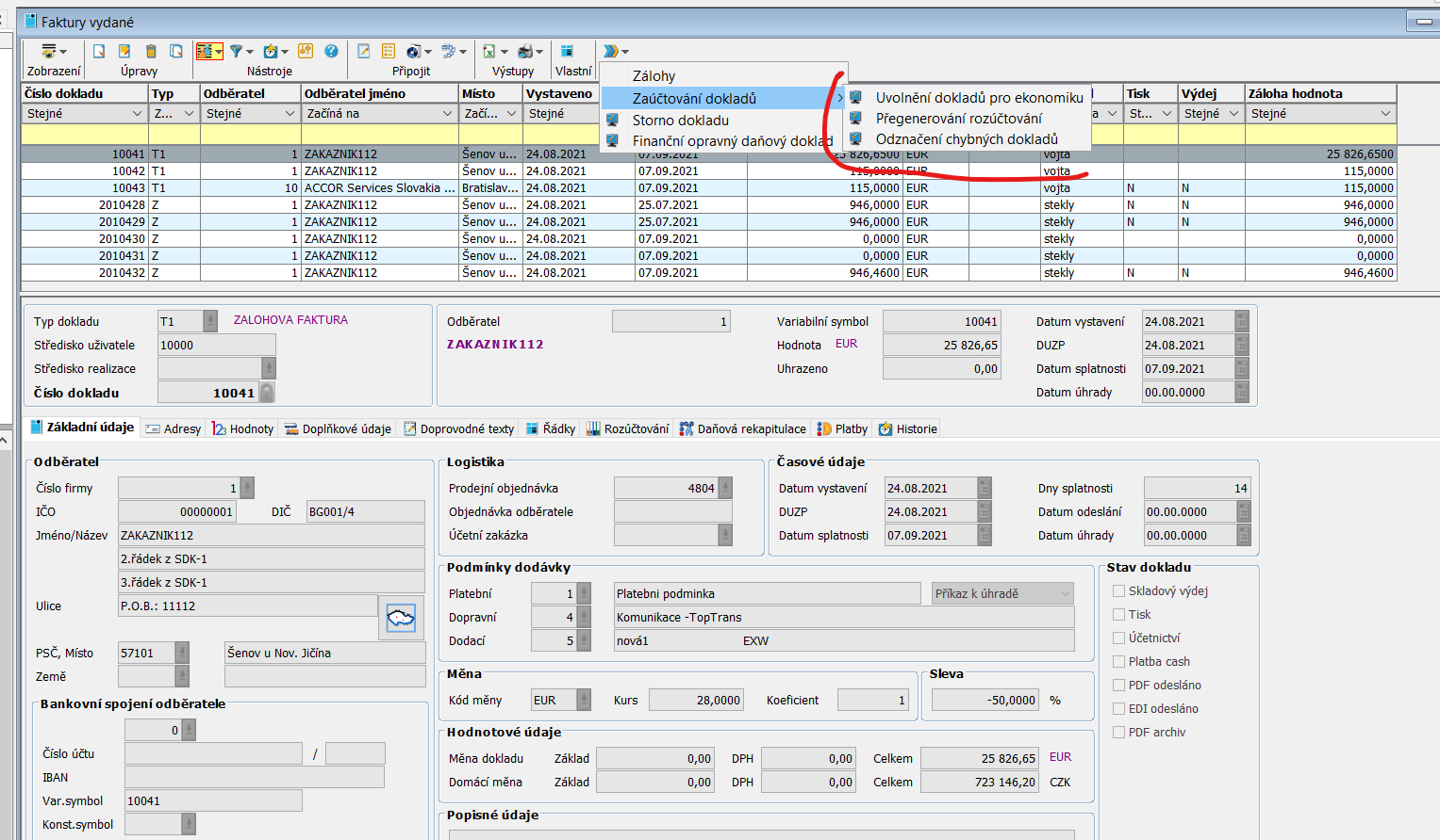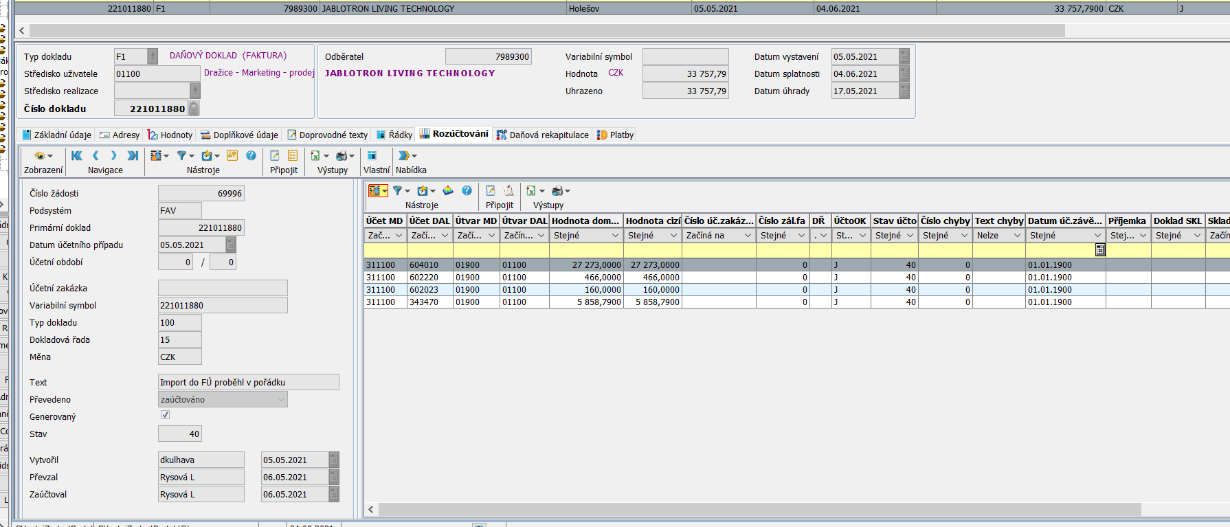Zobrazení žádosti o zaučtování vydané faktury