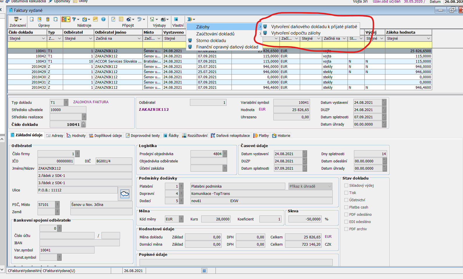 nad atributem Záloha běžný doklad , zálohová faktura , dańový doklad o přijaté platbě nad atributem Platba neuhrazeno , uhrazeno částečně, uhrazeno kompletně
