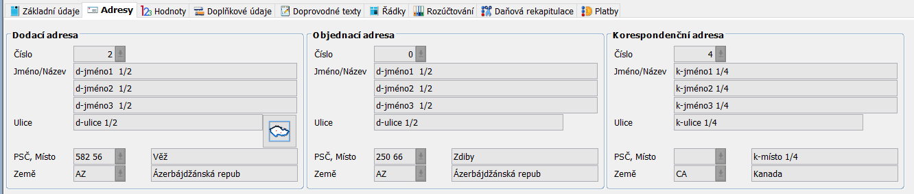 Základní údaje obsahují informace o odběrateli, bankovním spojení, logistice, dále obsahují časové údaje dodávky, podmínky dodávky, měna , popis a stav dokladu. Dále je možné zvolit jazyk dokladu.
