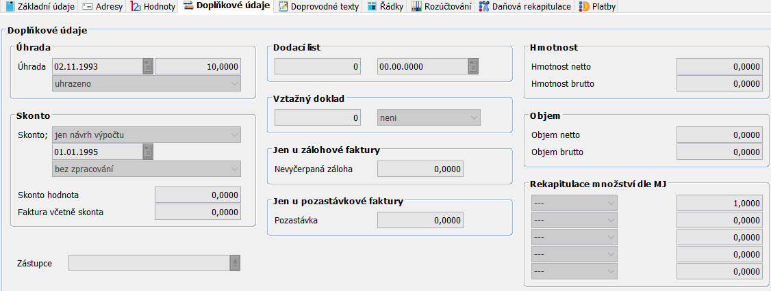 Doplňkové údaje informují o hmotnosti, objemu a množství položek vztahujících se k dané faktuře. Dále obsahují informace o úhradě, dodacím listu, vztažených dokladech a podobně.