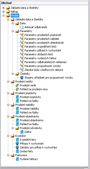 Ve složce Základní data a číselníky jsou veškeré pomocné úlohy pro všechny úlohy v oblasti prodeje. Zde lze najít například adresáře a návazné úlohy, které jsou využívány pro automatické doplňování údajů při tvorbě obchodních dokladů a v dalších úlohách. Do těchto pomocných úloh se uživatel dostává proklikem z detailu při vytváření nových záznamů, nebo při úpravě již existujících záznamů.