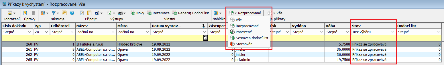 - Rozpracované - zobrazí se ty příkazy k vychystání, které jsou bez řádku nebo jsou ve stavu zpracování, tj. nejsou potvrzené