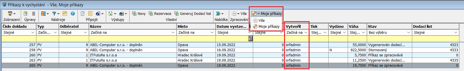 - Předdefinovaným čtyřlístkovým filtrem zobrazit příkazy dle stavu zpracování a zároveň příkazy mnou založené nebo všechny bez upřesnění.