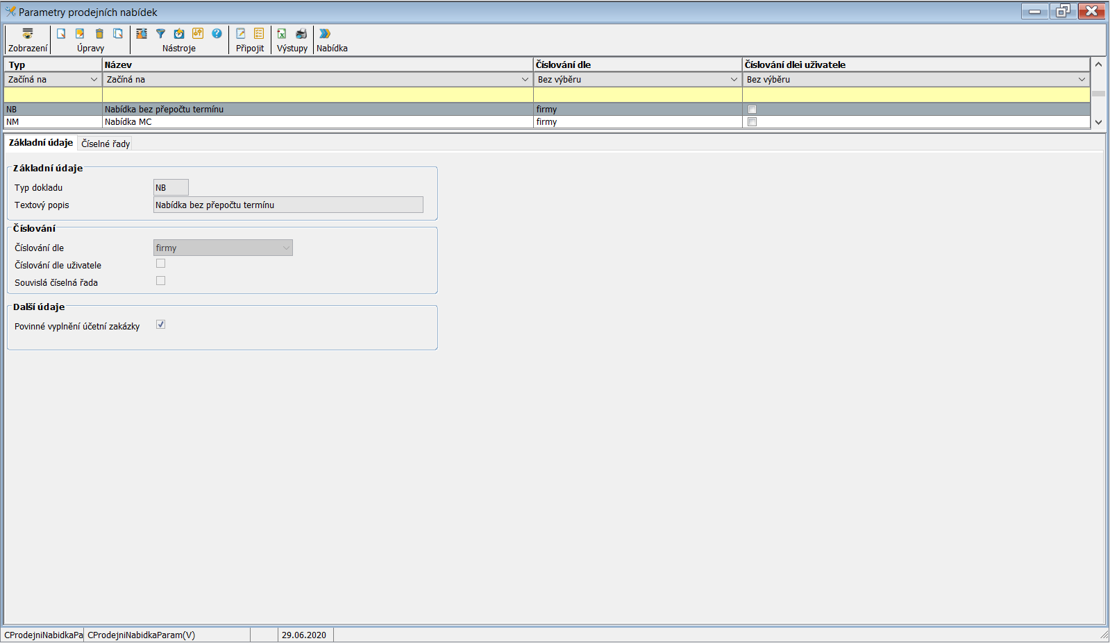 Obsahuje nastavitelné parametry pro správnou funkci modulu Prodejní nabídka.