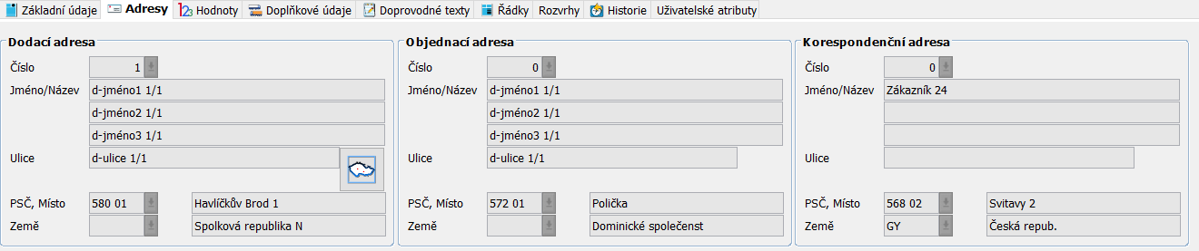 Ke každé objednávce je možnost přiřadit až 3 adresy (Dodací - adresa dodání, Objednací - adresa objednavatele, Korespondenční - adresa fakturace).