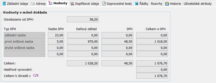 Hodnoty v měně dokladu včetně sazeb DPH: