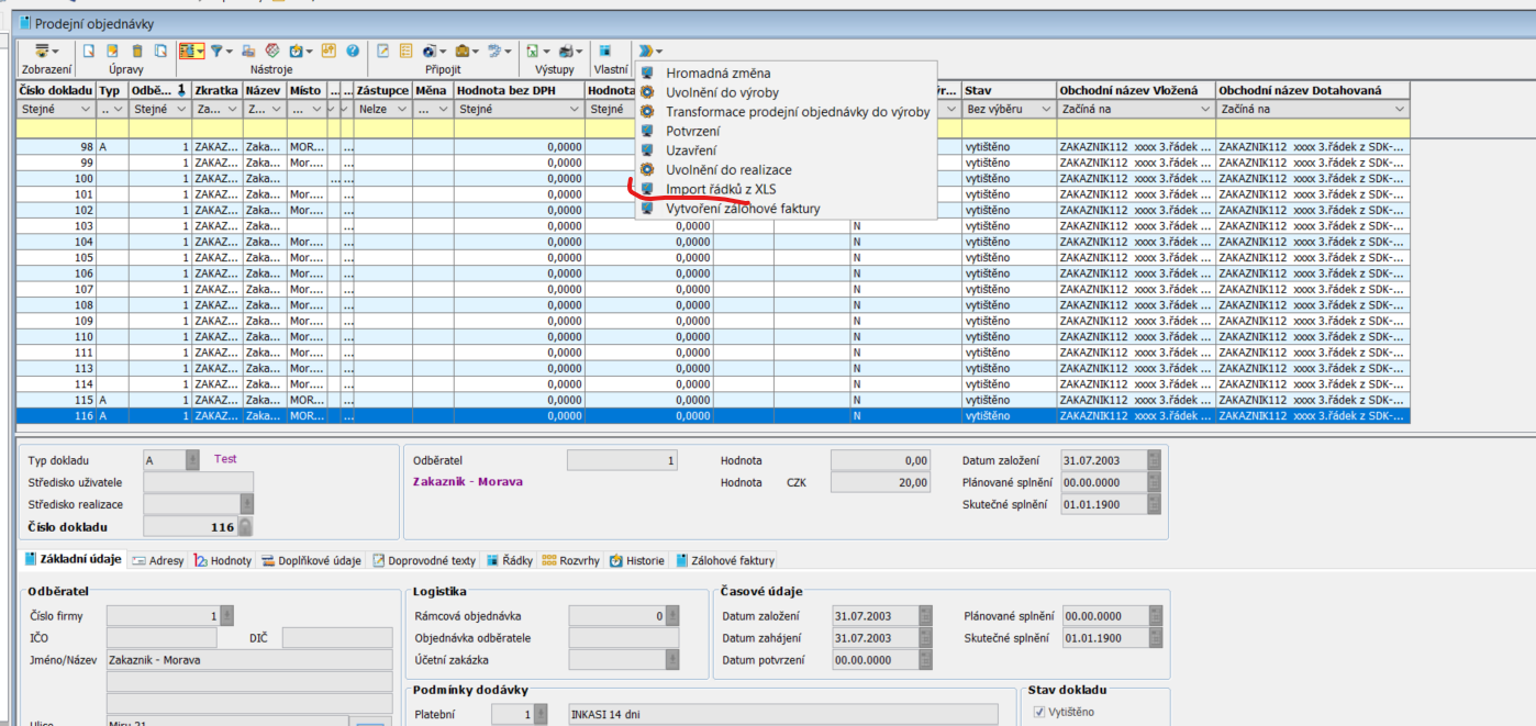 - Uživatel se nastaví na existující hlavičku prodejní objednávky a zvolí funkci import řádků prodejní objednávky z Excelu