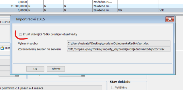 Funkce slouží k importu řádků prodejní objednávky k existující hlavičce z Excelu (xls,xlsx). funkce je distribuována jako skrytá a uživatel si ji musí v menu funkcí aktivovat