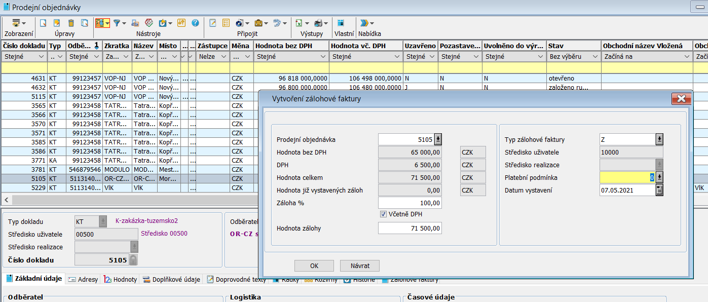 3.5. Vytvoření zálohové faktury k prodejní objednávce