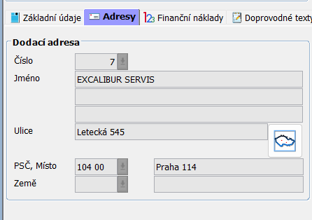 V záložce Adresa se dodací adresa naplní dle čísla prodejní objednávky, nebo z čísla dodacího listu. Adresu též můžeme editovat - vložit pomocí prokliku