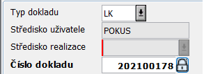 Vyplníme Typ dokladu, Středisko uživatele se naplní automaticky. Středisko realizace se dle nastavení naplní automaticky, nebo ho manuálně vyplníme. Automaticky se vygeneruje Číslo dokladu.