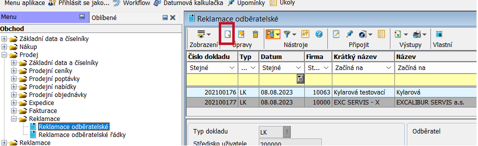 V menu Obchod / Prodej / Reklamace / Odběratelské reklamace použijeme tlačítko Nový záznam