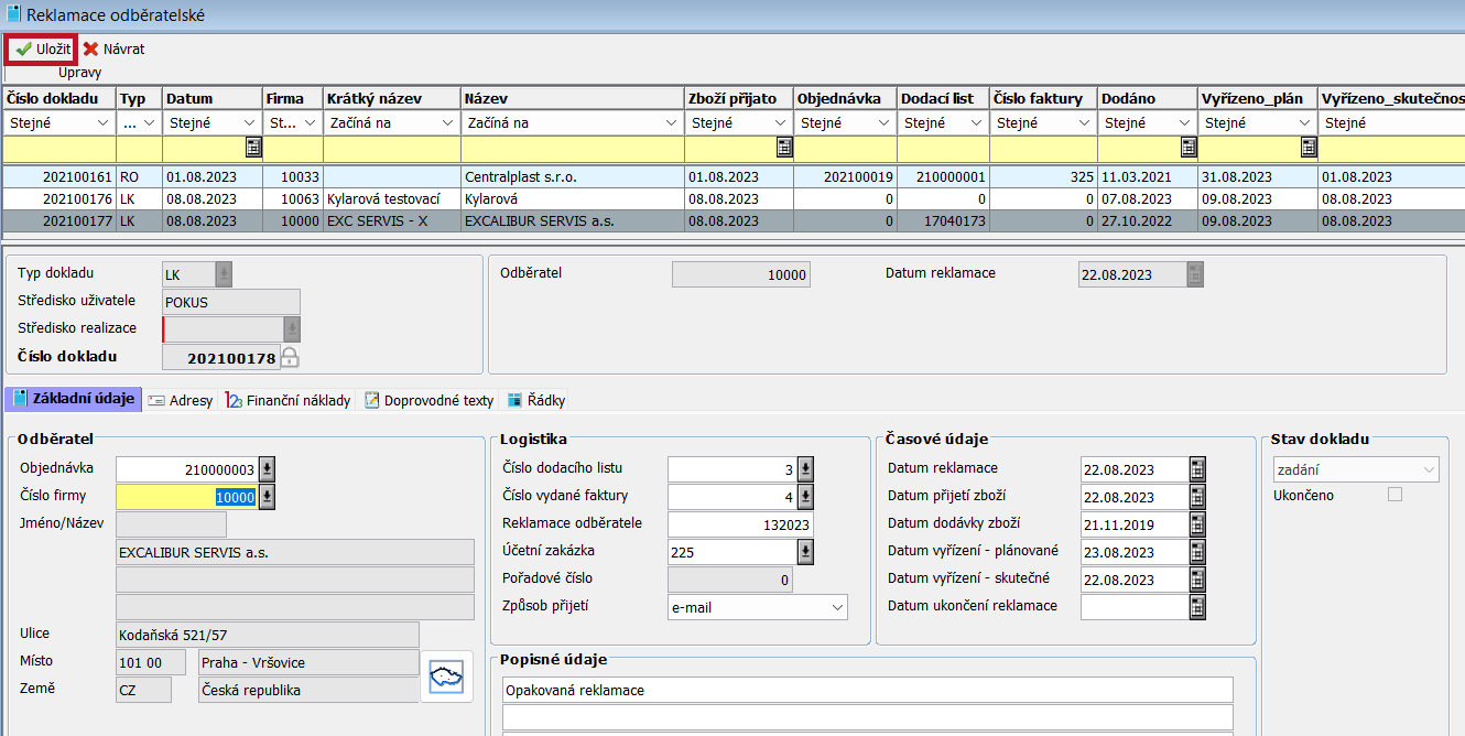 Po vyplnění požadovaných atributů základních údajů záznam uložíme