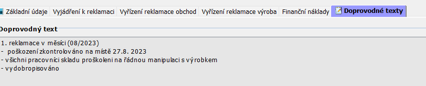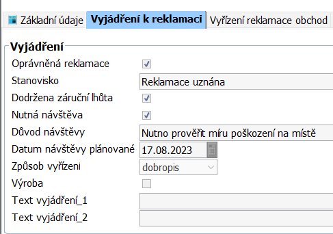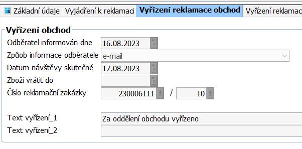 V záložce evidujeme informace ohledně komunikace s odběratelem, datum skutečné návštěvy odběratele (zpravidla se provádí z důvodu ověření neshody a jejího rozsahu), termín případného vrácení zboží.