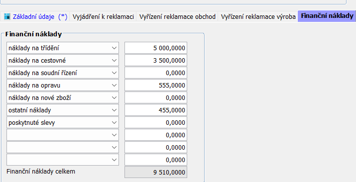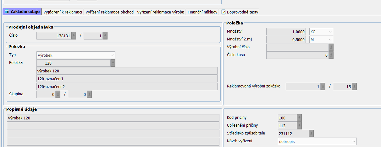 V této záložce evidujeme základní atributy řádku, jakými jsou zejména reklamovaná položka, provázanost na obchodní a výrobní doklad a atributy k příčině neshody: