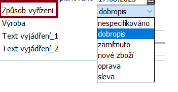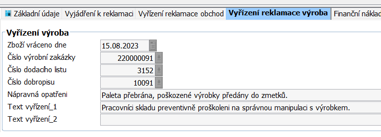 Atributy v záložce jsou v kompetenci výrobního oddělení. Evidují zde způsob nápravného a případně i preventivního opatření k reklamaci.