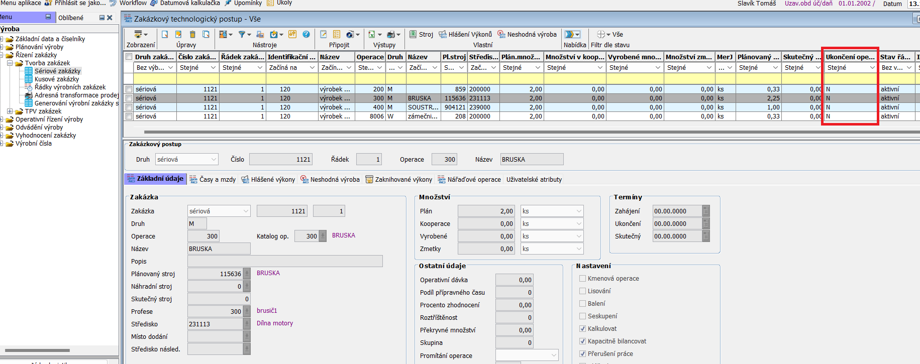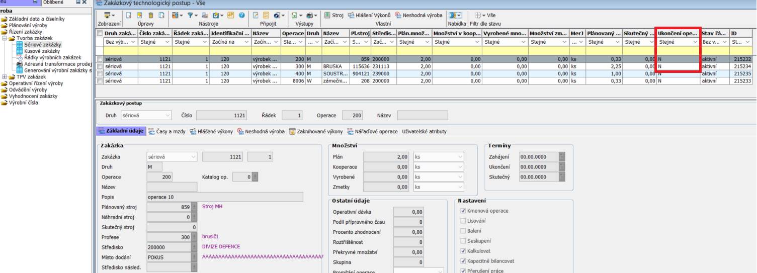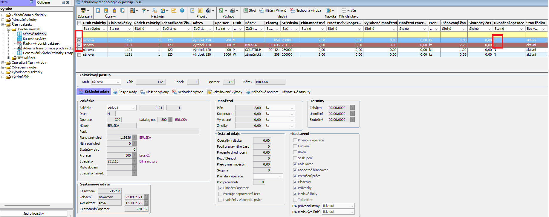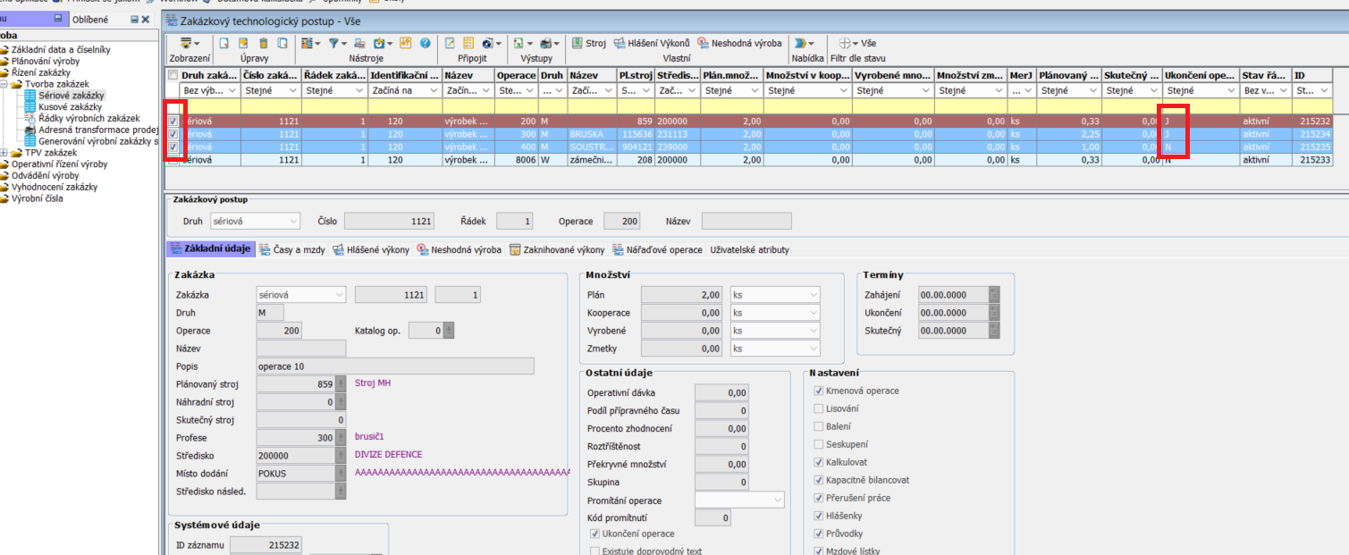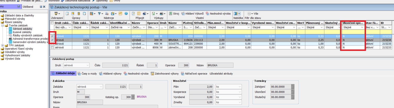Oba zpracované řádky nyní vidíme otevřené. Ve sloupci Ukončení operace mají status N.