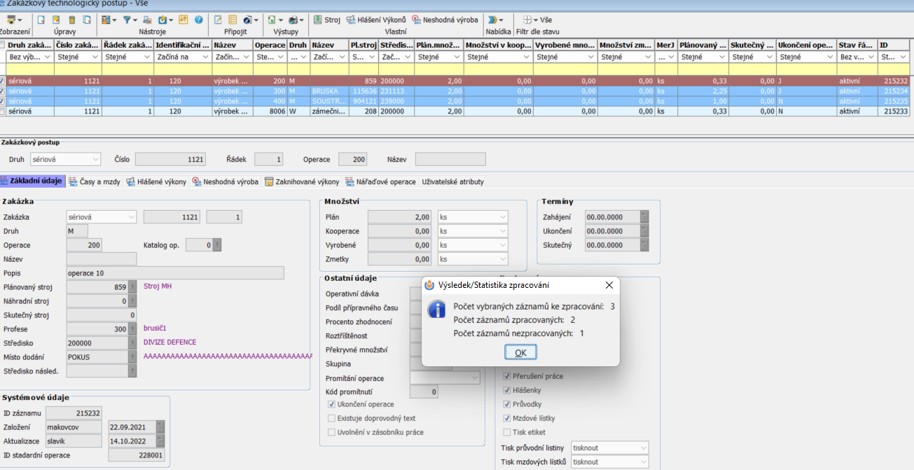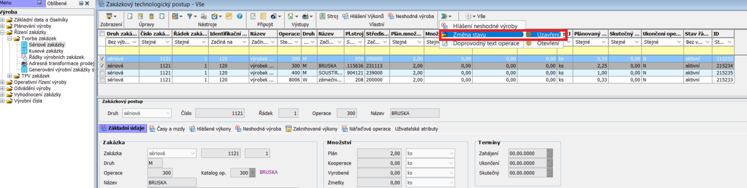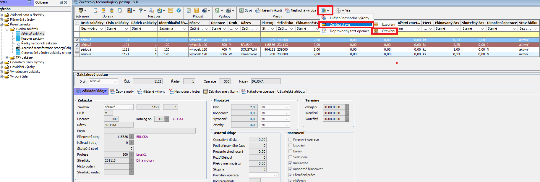Každou operaci technologického postupu k vybrané zakázce je v případě potřeby možné znovu otevřít, či uzavřít. Tyto úpravy lze provádět jak jednotlivě, tak hromadně, pomocí zaškrtnutí vybraných řádků (operací) v checkboxu.