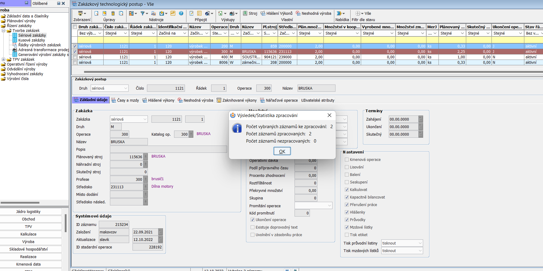Oba zpracované řádky nyní vidíme uzavřené. Ve sloupci Ukončení operace mají status J.