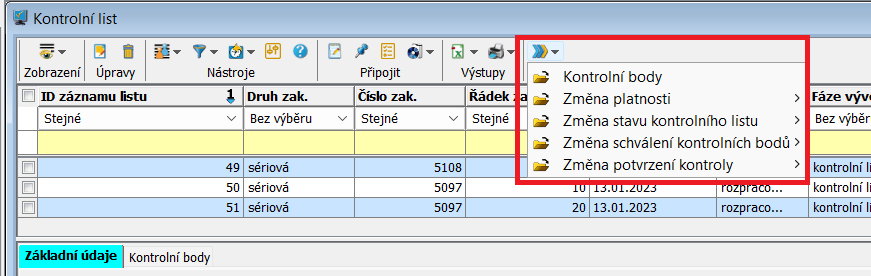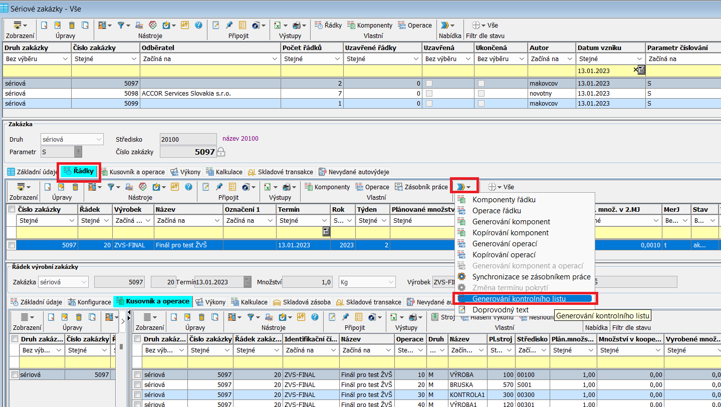 Vlastní tvorba kontrolního listu probíhá nad řádkem dané zakázky použitím tlačítka Nabídka