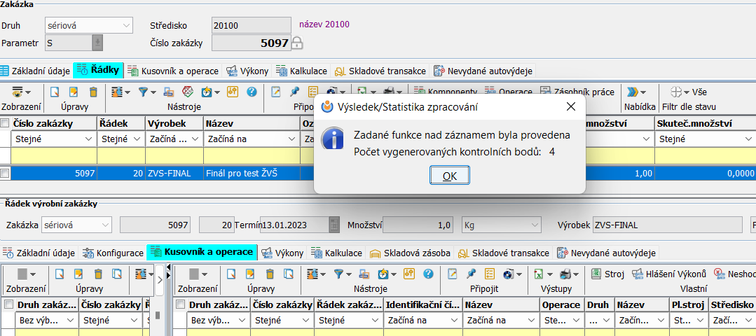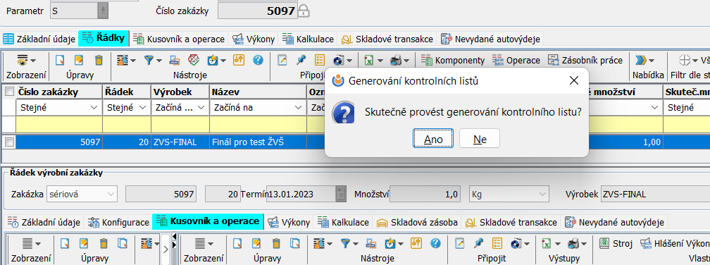 Tvorba kontrolních listů navazuje na modul Výroba / Řízení zakázky / Tvorba zakázek, vytvořením výrobní zakázky, přitažením kusovníku a postupu, výdeje komponent s tavbou na výrobní zakázky.