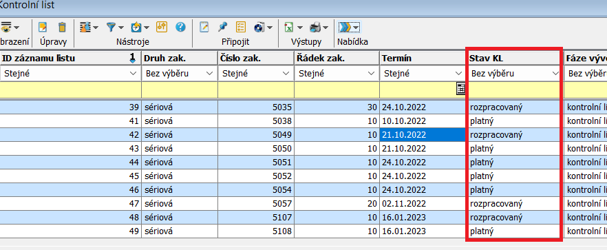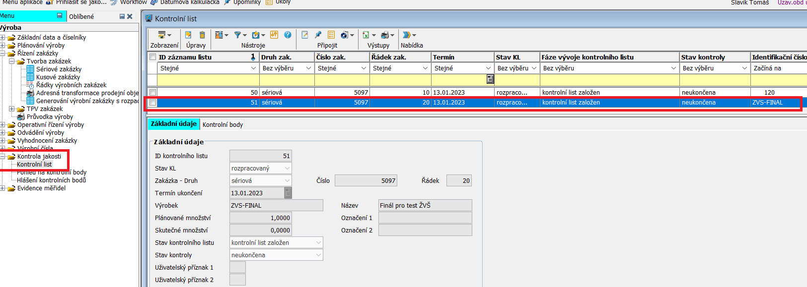 Záznam vytvořeného KL se zobrazí v seznamu v úloze Kontrolní list (menu Výroba / Kontrola jakosti).