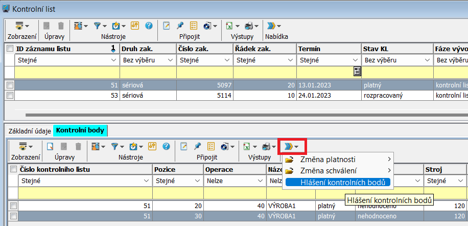 Úlohu pro hlášení KB nalezneme v menu Výroba / Kontrola jakosti / Hlášení kontrolního bodu , nebo v menu Výroba / Kontrola jakosti / Kontrolní list - záložka Kontrolní body. V jejím podmenu se nachází Hlášení kontrolního bodu.