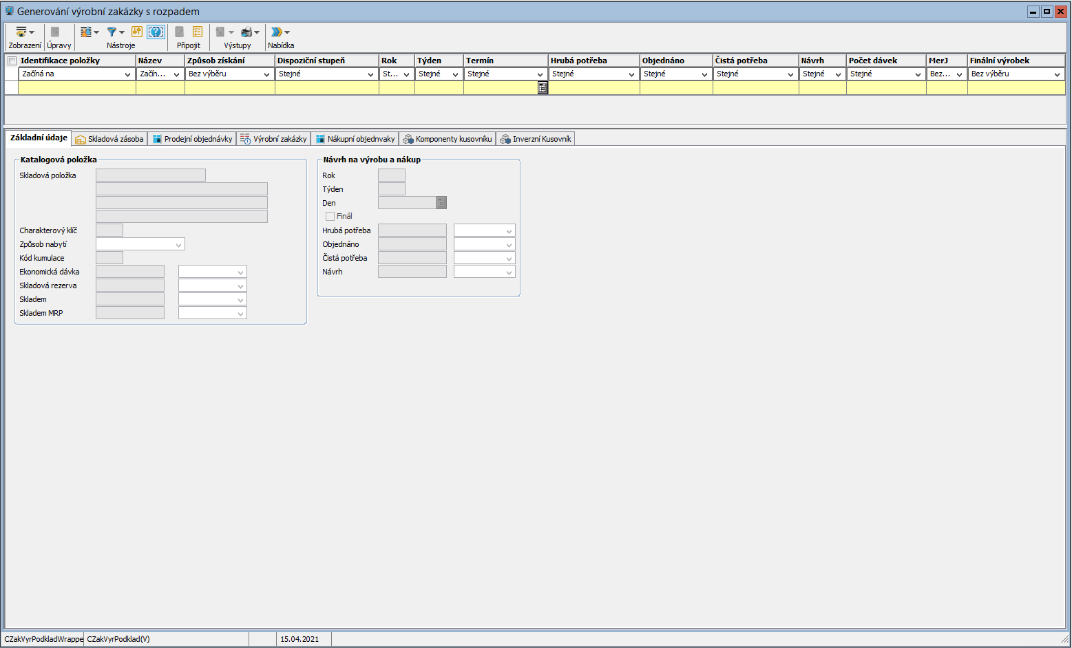 Modul slouží pro generování neadresné výrobní zakázky pro finální výrobek / prodejní objednávku s rozpadem. Při generování je množství navrhováno dle kusovníkového rozpadu / se zohledněním stavu skladů / se zohledněním stavu skladů a rozpracovanosti.
